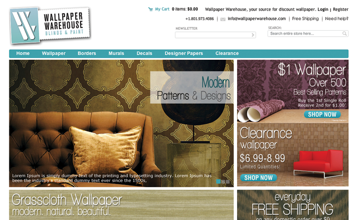 Implementing a new website design and complete development for Wallpaper Warehouse using a Magento ecommerce platform. The design features slides, custom product relations, call-to-action elements, and multiple attribute creation.